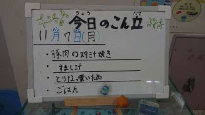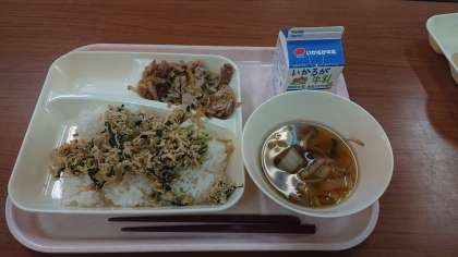 豚肉のスタミナ焼き、すまし汁、とり菜っ葉炒め、ご飯、牛乳でした。豚肉のスタミナ焼きは、ご飯が進む味付けの美味しい一品でした。