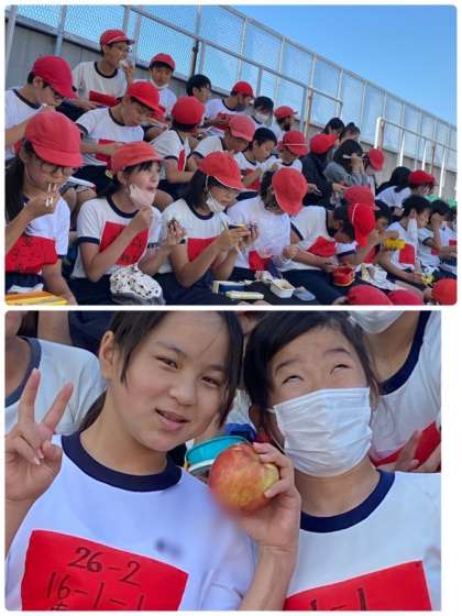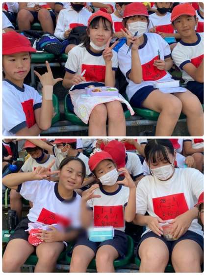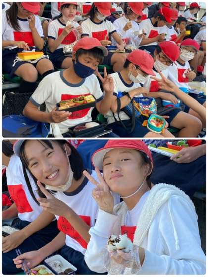 ?競技を終え、給食に間に合わないので、みんなでお弁当を食べています。お弁当を食べたら戻り、午後は教室で学習します。