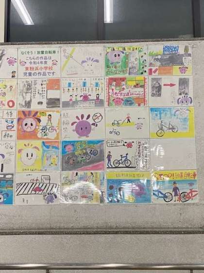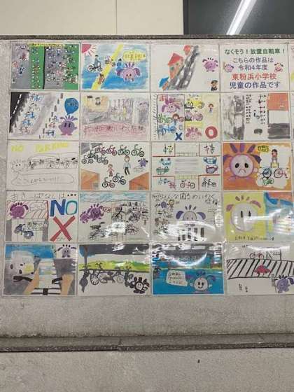 4年生が描いた、なくそう!放置自転車のポスターが、南海粉浜駅に掲示されています。