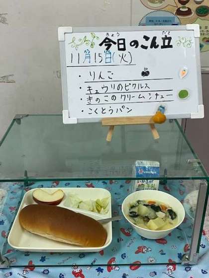 きのこのクリームシチュー、キャベツのピクルス、りんご、黒糖パン、牛乳