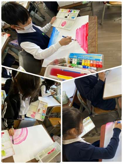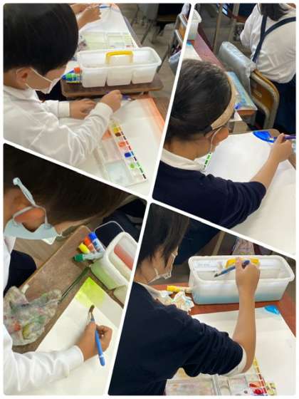 絵の具と水を混ぜて、グラディアーションを表現しています。思い思いに画用紙に描いています。
