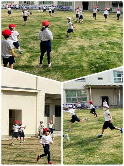 中庭の芝生で、思いっきり鬼ごっこで走り回っています。この前のオーバーシードのおかげで冬柴も育ってきています。気持ちよく運動できています。