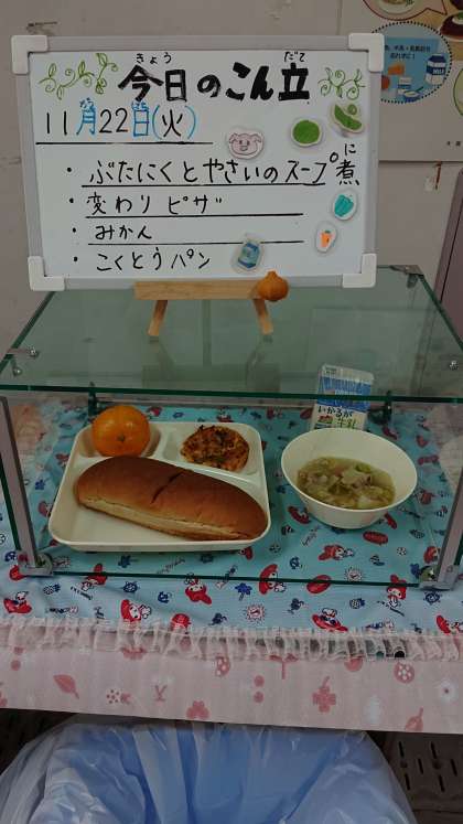 豚肉と野菜のスープ煮、変わりピザ、みかん、黒糖パン、牛乳です。変わりピザは、餃子の皮にツナと小さく切ったピーマン、粒コーン、チーズをピザソースと混ぜてパリパリに焼いた美味しい一品です。