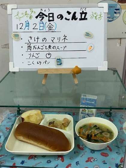 鮭のマリネ、肉団子と麦のスープ、黒糖パン、りんご、牛乳
