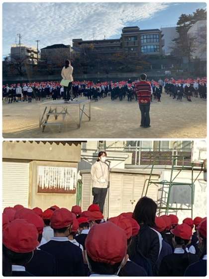 校長先生からは、今週3年以上の学年は学力経年調査があること、寒くなり体調をくずしやすい時なので、寒さに負けない身体をつくること、早寝早起き朝ごはん、手洗い、うがい、消毒、マスク、換気、ソーシャルディスタンスなどを心がけましょう、というお話でした。