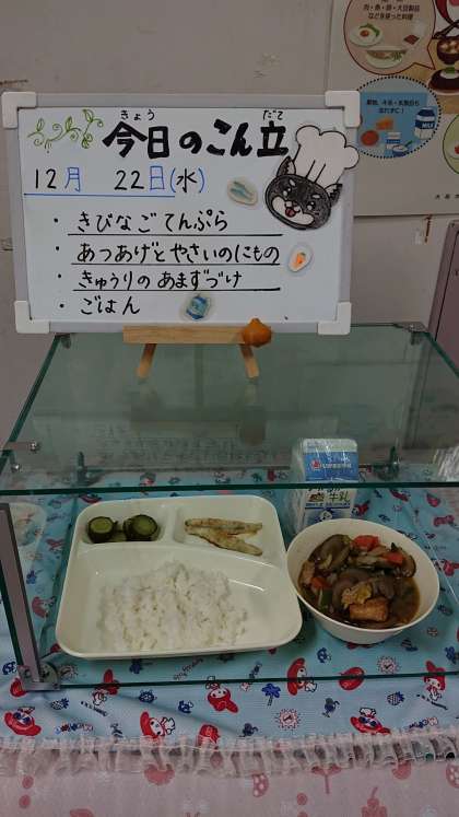 きびなごの天ぷら、厚揚げと野菜の煮物、きゅうりの甘酢づけ、ご飯、牛乳です。きびなごの天ぷらはサクサクに揚がって、頭から尾まで美味しくいただける一品でした。
