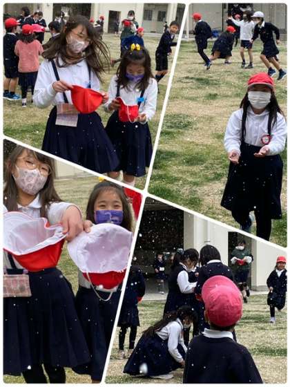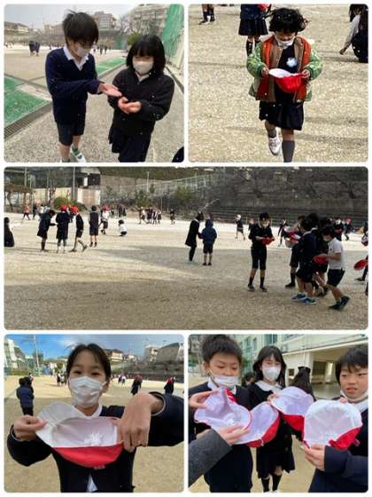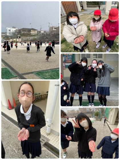 子どもたちは大喜びで、雪を触っていました。雪が珍しいので赤白帽で集めている子もたくさんいました。