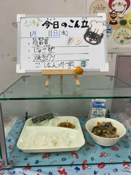 です。具沢山の煮物に、ご飯がすすむじゃこ豆という献立です。3学期最初の給食です。