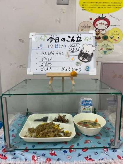 きんぴらチラシ、雑煮、ごまめ、牛乳