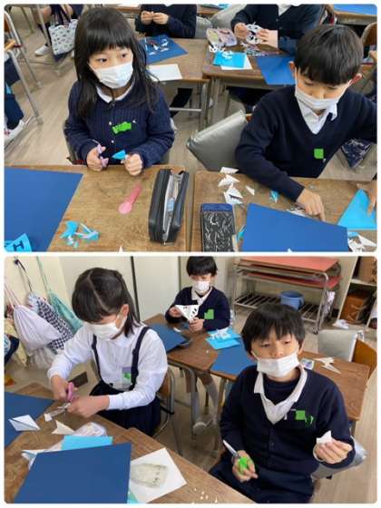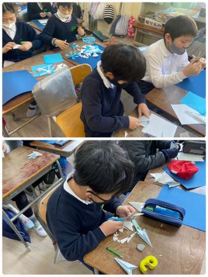 折り紙を折って切って、雪の結晶を作りました。はじめは、なかなかうまくいきませんでしたが、慣れると思い思いの形に切っていました。2月の玄関掲示にも使います。楽しみにしてください。