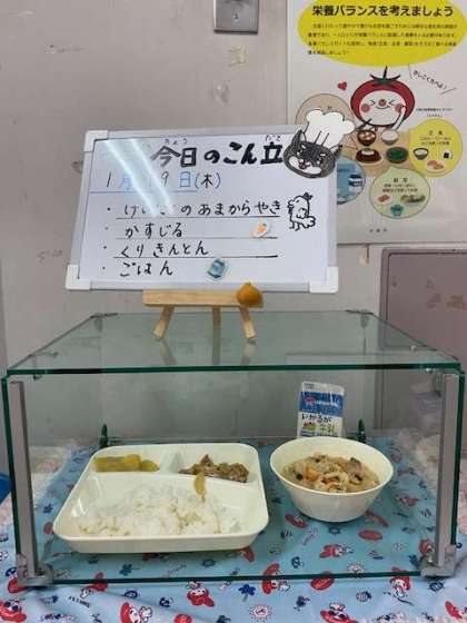 鶏肉の甘辛焼き、粕汁、栗きんとん、ご飯、牛乳