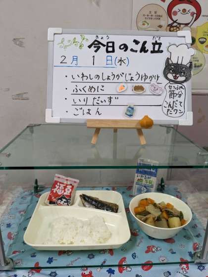 いわしの生姜じょうゆかけ、含め煮、入り大豆、ご飯、牛乳