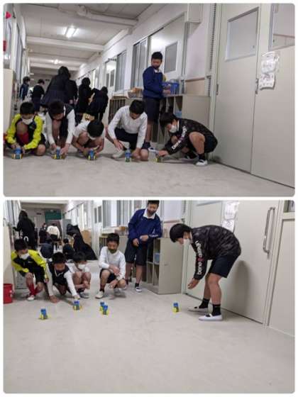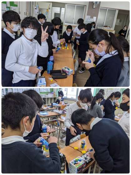 写真は走るねこライトの製作の様子です。コンデンサーに手回し発電機で電気をためて走らせます。