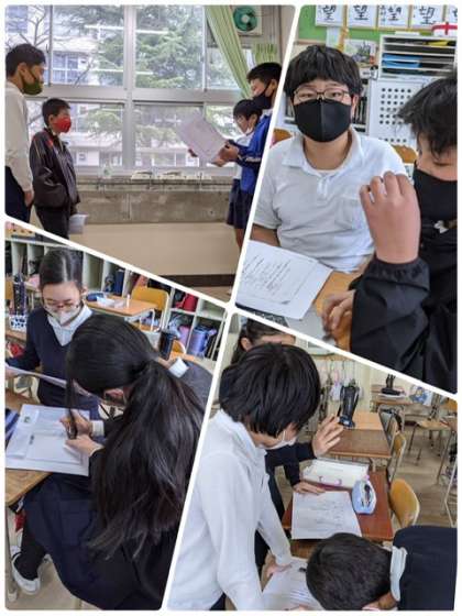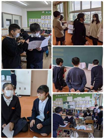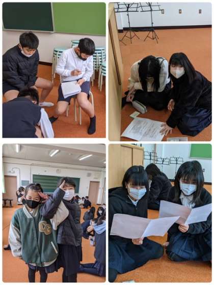金曜日の漫才ワークショップの練習をしています。友だちとネタを直したり、動きをつけたりして、面白さをアップさせています。
