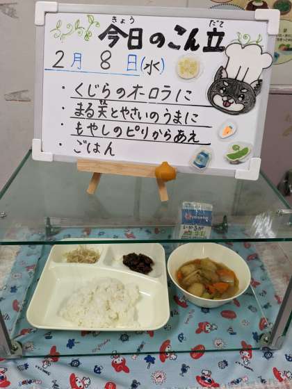 くじらのオーロラ煮、まる天と野菜の旨煮、もやしのピリ辛あえ、ご飯、牛乳でした。くじらのオーロラ煮は、甘酸っぱい餡がかかった美味しい一品でした。