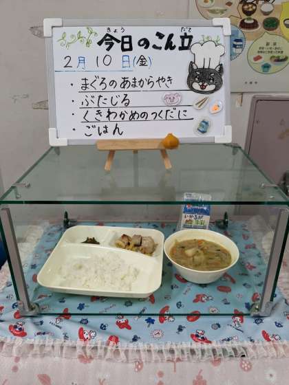 まぐろの甘辛焼き、豚汁、茎わかめの佃煮、ご飯、牛乳でした。まぐろの甘辛焼きは、ねぎとまぐろを醤油だしで味付けした美味しい一品でした。