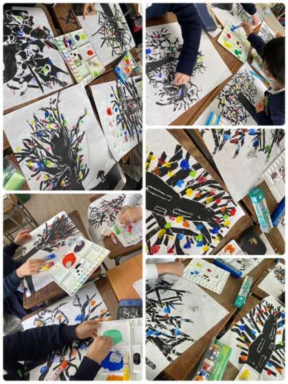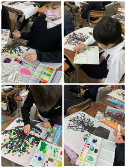 モチモチの木に、灯をつけました。アルミホイルを丸め、絵の具をつけて、ペタペタ。色んな色のモチモチの木が完成しました。