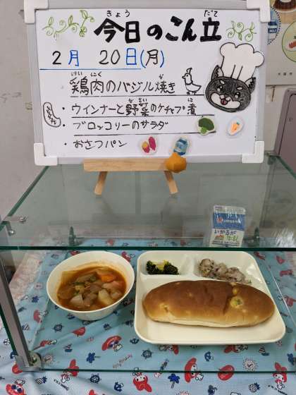 鶏肉のバジル焼き、ウィンナーと野菜のケチャップ煮、ブロッコリーのサラダ、おさつパン、牛乳でした。鶏肉のバジル焼きは、バジルの香りが口いっぱいに広がる美味しい一品でした。