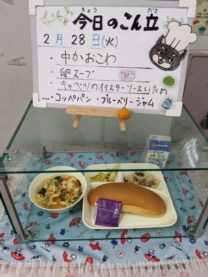 中華おこわ、卵スープ、キャベツのオイスターソース炒め、コッペパン、ブルーベリージャム、牛乳でした。卵スープは、口の中にフワフワ溶き卵が優しく広がる美味しい一品でした。