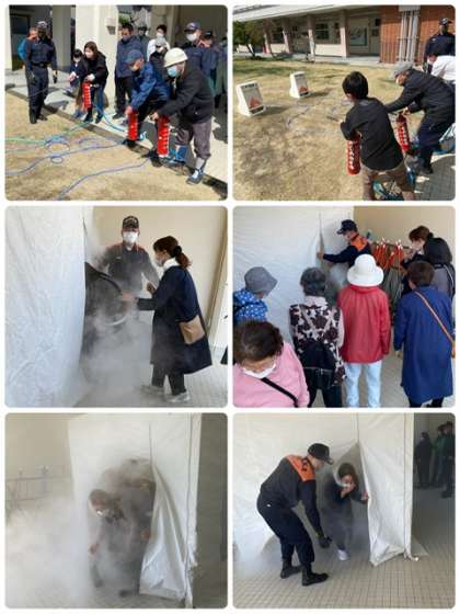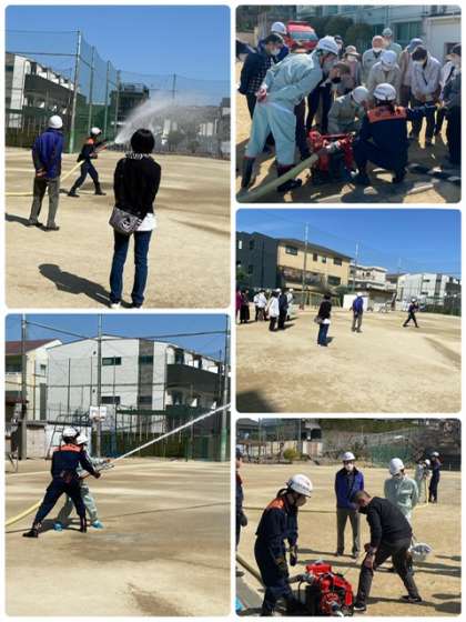 3班に分かれて、消防署からの煙体験、消火器訓練、可搬式ポンプ操作訓練、区役所からの研修などに取り組みました。