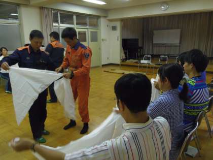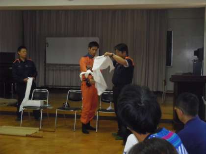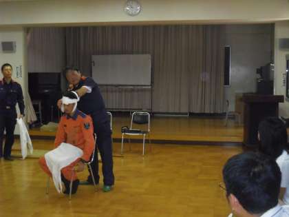 研修会では、講師の住吉消防署の署員の皆様から「骨折」などに対する応急措置の仕方などを学びました。
