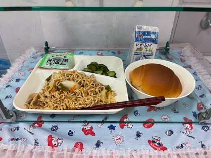 焼きそばも、子どもたちには人気のメニューです。よく噛んでしっかり美味しくいただきましょう!