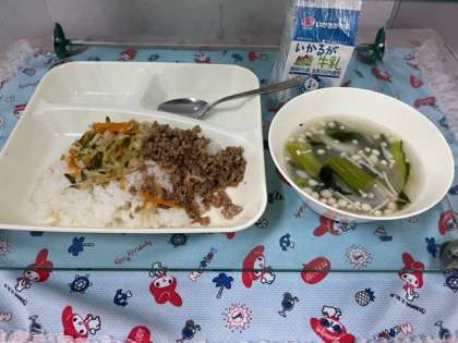 今日の給食の献立はビビンバ、トック、ごはん、牛乳です。