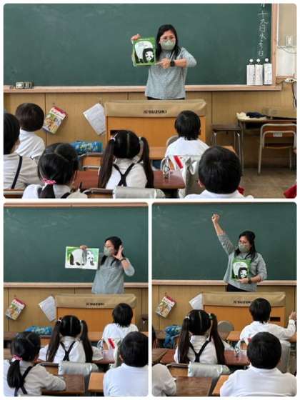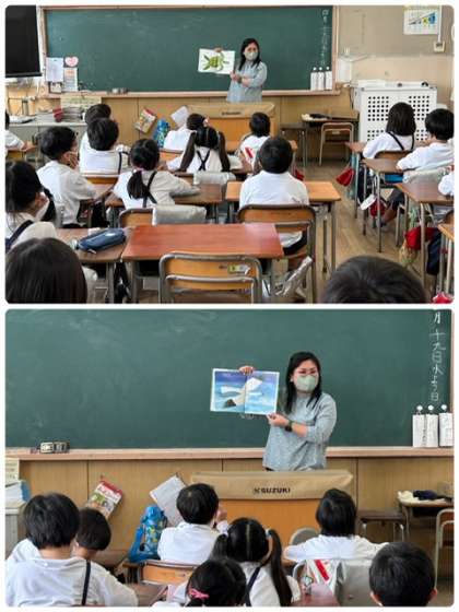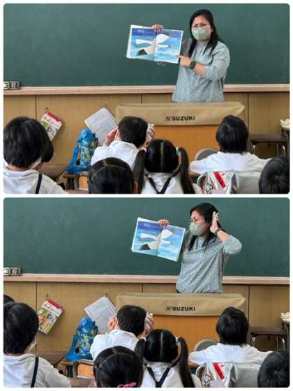 C-NETの先生が来校している日に、低学年から絵本の読み聞かせにまわっています。短い時間ですが、ネイティブな英語の音声に触れる良い機会になっています。子供たちは楽しみながら聞いています。「turn the page〜」と声を合わせて言いながら次のページをめくるよう声かけをしたり、絵本に出てくるものについて英語で言ったりすることで簡単な英語のやり取りもしています。次はどこのクラスに行くのかお楽しみです。