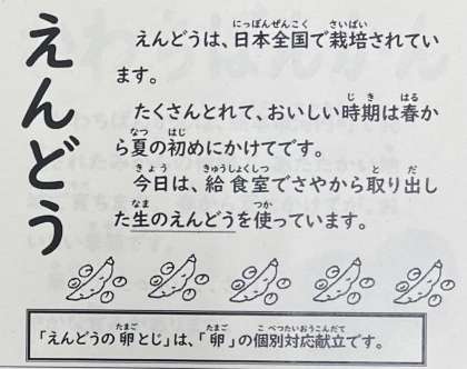 今日の給食の献立は、赤魚のしょうゆだれかけ、みそ汁、えんどうの卵とじ、ごはん、牛乳です。