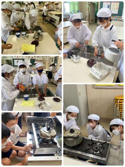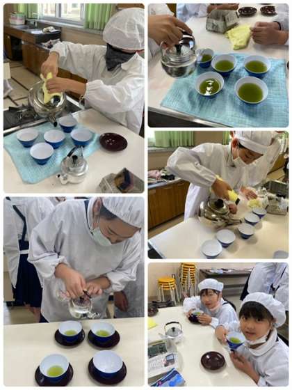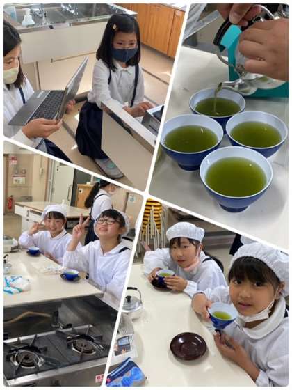 5年生が家庭科で初めての調理実習をしました。おいしいお茶を入れようということで、緑茶を入れて飲みました。おいしい〜!苦い〜!など色々な感想がありましたが、無事に実習が終わりました。