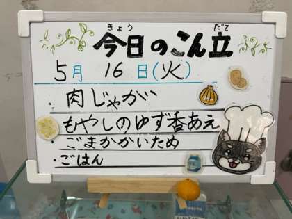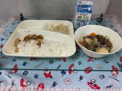 ?今日の給食の献立は、肉じゃが、もやしのゆずの香あえ、ごまかかいため、ご飯、牛乳です。