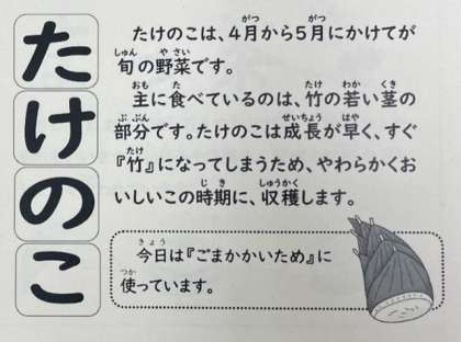 春の味覚であるたけのこを使った献立です。たけのこをごまやかつお節と一緒に炒めて、ふりかけ風にごはんに添えていただきます。たけのこが苦手な子ども達にとっても食べやすいように調理されています。
