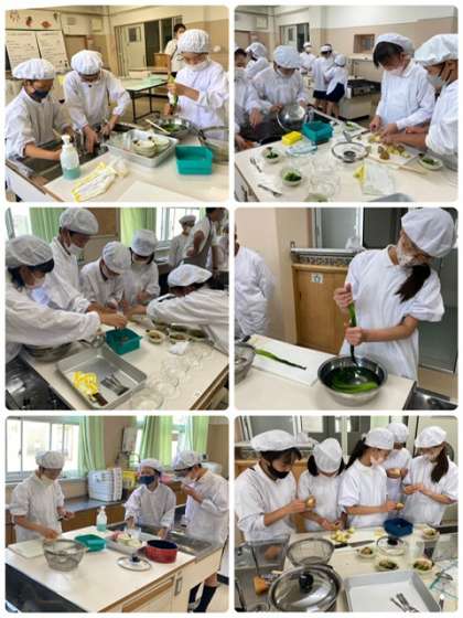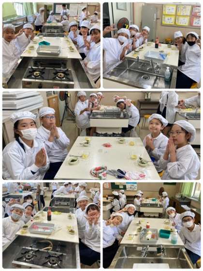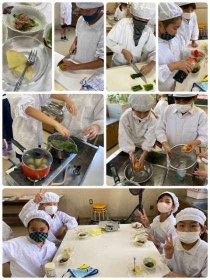 青菜は小松菜、じゃがいもをゆでて食べました。先に小松菜を切ってしまったり、じゃがいもを切るのに苦戦したりしましたが、最後にはおいしくいただくことができました!家でも作ろうやレストラン開けるわ、などといつ自信たっぷりの声が聞こえてきました。