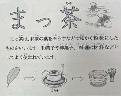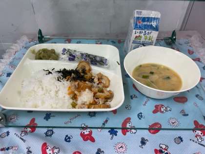 今日の給食の献立は、かやくごはん、味噌汁、抹茶ういろう、牛乳です。
