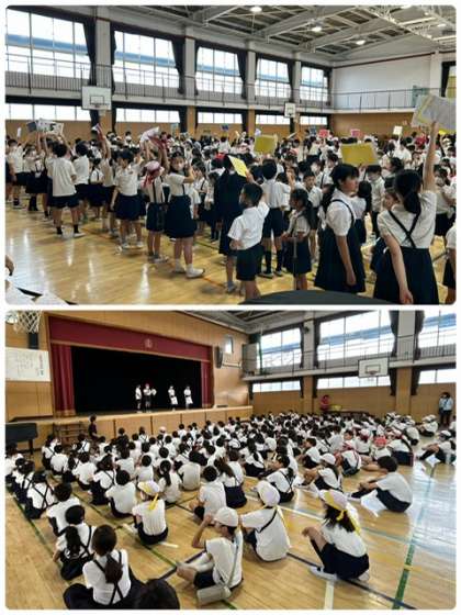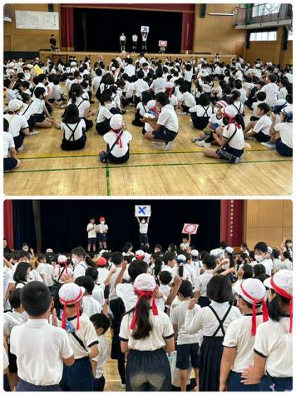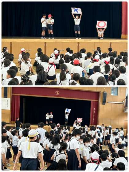 たてわり班による児童集会です。今日は、◯×クイズです。班で相談して答えを決めていました。