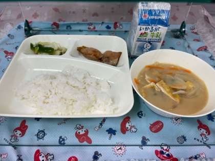 今日の給食の献立は、鶏肉のしょうゆバター焼き、みそ汁、野菜炒め、ごはん、牛乳です。