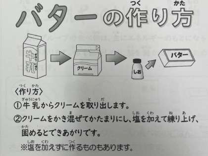 バターには、乳脂肪とビタミンAが豊富に含まれています。ビタミンAは、成長に欠かせない大切なもので、肌や粘膜を健康に保ち、細菌に対する抵抗力を強めるそうです。また、カルシウムの吸収を促進するビタミンDや、老化を防ぐビタミンEも含まれています。