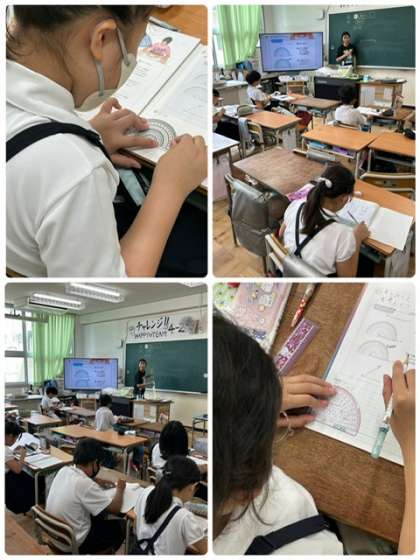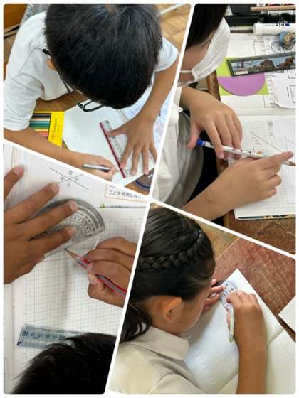 分度器を使って、角をかく、という学習をしていました。使い慣れない分度器を使って、何度も書く練習に取り組んでいます。