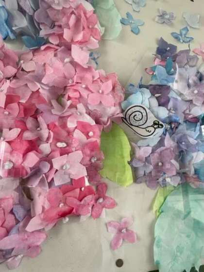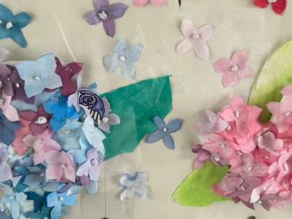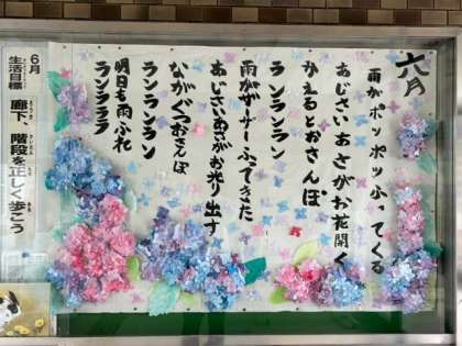 玄関の6月の掲示物が力作です。このアジサイ、立体になっています。素敵な色合いです。そして、カタツムリも隠れています。