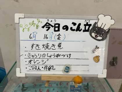今日は子ども達に人気の「すきやき」でした。牛肉を主材に糸こんにゃく、あつあげ、玉ねぎ、えのきたけを使用しています。