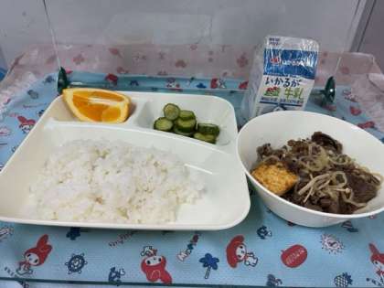 今日の給食は、すき焼き煮、きゅうりのしょうがづけ、オレンジ、ごはん、牛乳です。