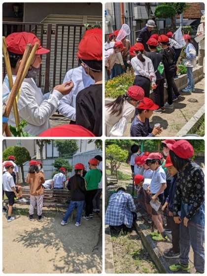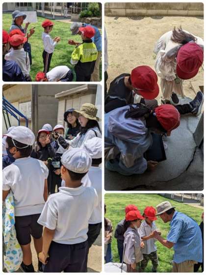 中庭、学習園、校庭、見つけた生き物の名前と特徴を教えてもらいます
