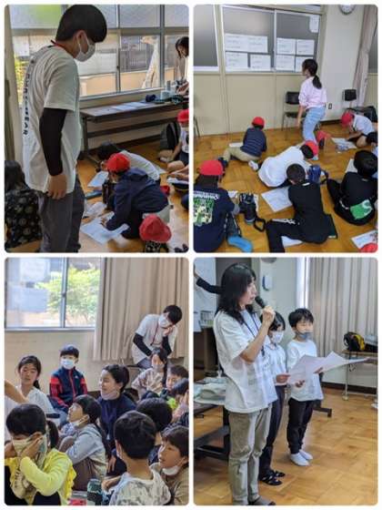 部屋に戻って、まとめと発表タイム。わずか20分程度で30種類前後の生き物を各班見つけることができて、子どもたちも達成感でいっぱいです!アメンボ、カマキリ、チョウ、ヘクソカズラ、キュウリグサ、解説を聞いて、さらに興味深い!!