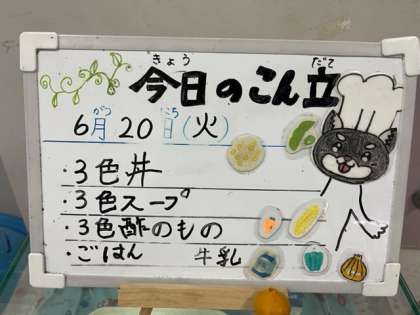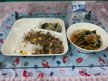 今日の給食は、3色丼、3色スープ、3色酢のもの、牛乳です。