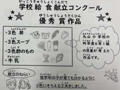 今日の献立は令和4年度の学校給食献立コンクールの優秀賞献立です。低学年の子が見てもわかるように、3色にそろえる工夫をされているようです。