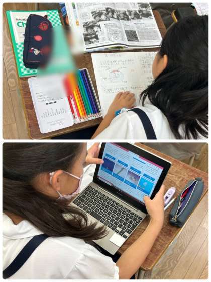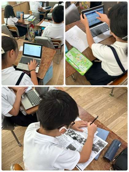 探究学習として、台風についてまとめていました。端末を使うなど自分たちで調べて、プリントに上手にまとめていました。