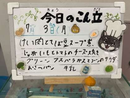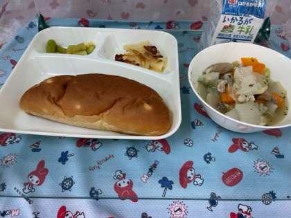 今日の給食は、鶏肉とてぼ豆のスープ煮、じゃがいもとトマトのチーズ焼き、グリーンアスパラガスとコーンのサラダ、おさつパン、牛乳です。
