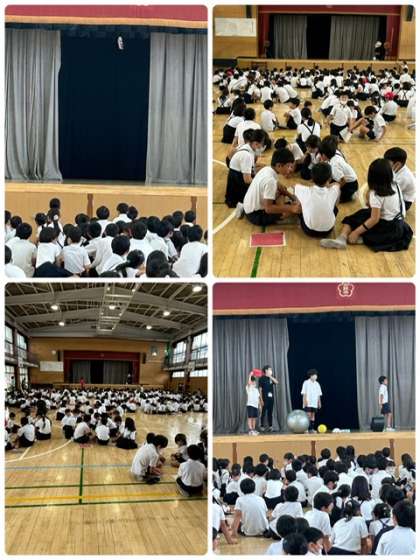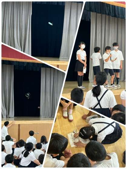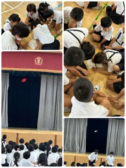 今日は、これは何でしょうクイズを楽しみました。4色各班ごとに分かれて、相談しながら、カーテンの間を飛ぶものを当てました。