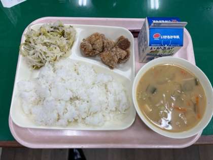 ???今日の給食は、豚肉のたつたあげ、みそ汁、切り干し大根のゆずの香のあえ、ごはん、牛乳です。