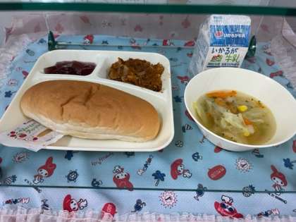 今日の給食は、なすのミートグラタン、スープ、ダイスゼリー(ぶどう)、コッペパン、りんごジャム、牛乳です。